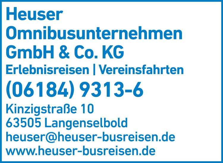 Die Adresse von Busreisen Heuser GmbH & Co. KG lautet: Kinzigstr. 10, 63505 Langenselbold