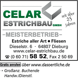 Die Adresse von CELAR Estrichbau GmbH lautet: Dieselstr. 6, 64807 Dieburg