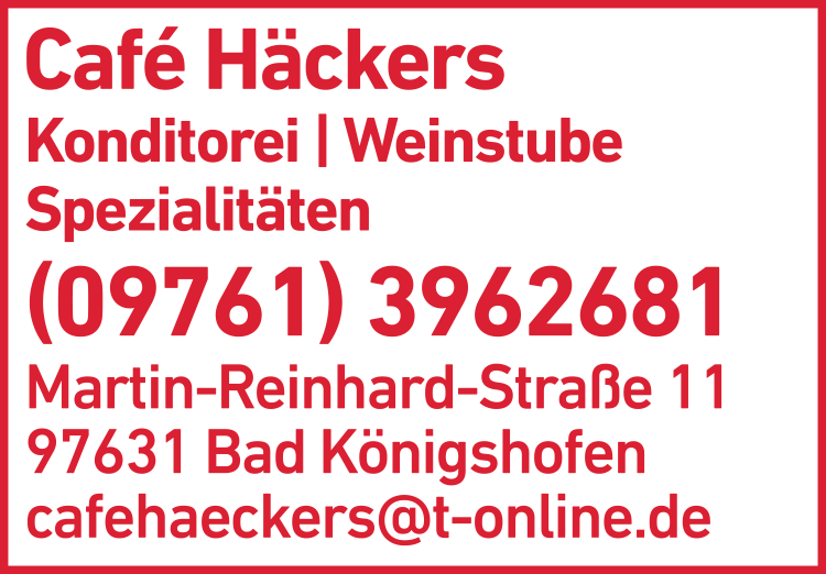 Die Adresse von Café - Häckers Konditorei lautet: Martin-Reinhard-Str. 11, 97631 Bad Königshofen