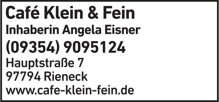 Die Adresse von Café Klein & Fein Inh. Angela Eisner lautet: Hauptstr. 7, 97794 Rieneck