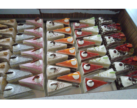 Wir aßen dort Kuchen und tranken Latte macchiato; alle Kuchen, die wir probierten waren gut, aber für unseren Geschmack schon recht süß, wobei unser Geschmack doch eher in Richtung weniger süß geht. Es stand uns eine Auswahl von fünf bis sechs verschiedenen Kuchen bzw. Torten zur Verfügung.