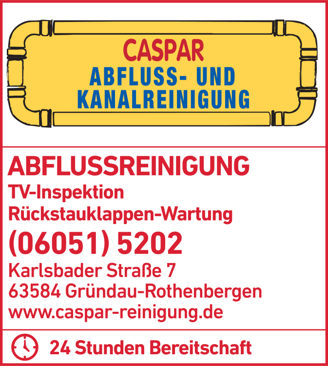 Die Adresse von Caspar Abfluss- und Rohrreinigung lautet: Karlsbader Str. 7, 63584 Gründau-Rothenbergen