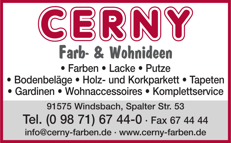 Die Adresse von Cerny Farb- und Wohnideen GmbH Raumausstattung lautet: Spalter Str. 53, 91575 Windsbach