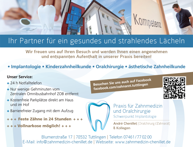Die Adresse von Chenillet André Oralchirurg/Zahnarzt lautet: Blumenstr. 17, 78532 Tuttlingen