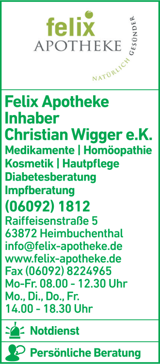 Die Adresse von Christian Wigger Felix-Apotheke lautet: Raiffeisenstr. 5, 63872 Heimbuchenthal