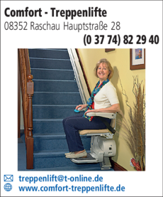 Die Adresse von Comfort Treppenlift lautet: Hauptstr. 28, 08352 Raschau