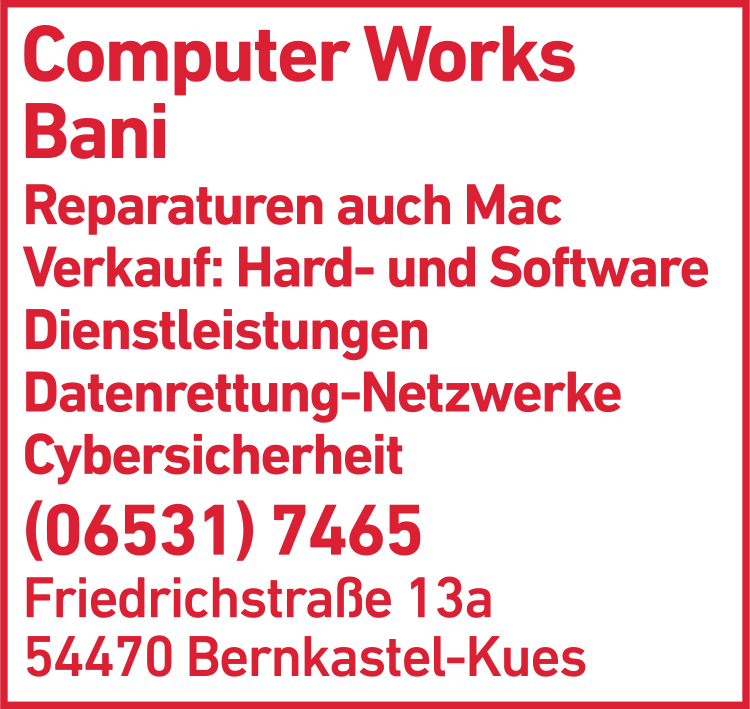Die Adresse von Computer Works Bani lautet: Friedrichstr. 13 A, 54470 Bernkastel-Kues