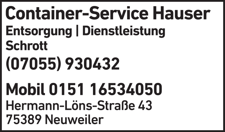 Container-Service Hauser 07055 93 04 32 Neuweiler Hermann-Löns-Str. 43 75389