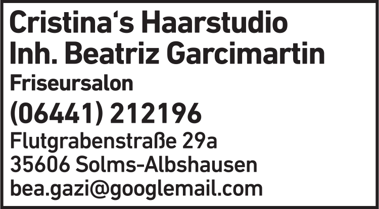 Die Adresse von Cristina's Haarstudio Inh. Beatriz Garcimartin lautet: Flutgrabenstr. 29 a, 35606 Solms