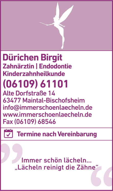 Die Adresse von Dürichen Birgit Zahnärztin lautet: Alte Dorfstr. 14, 63477 Maintal-Bischofsheim