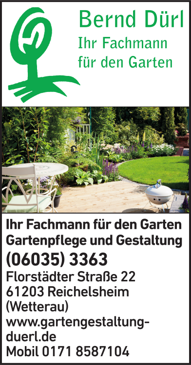 Dürl Bernd Gartenpflege & Gartengestaltung 06035 33 63 Reichelsheim Florstädter Str. 22 61203 de.teleauskunft.oetb.webapp2.detail.Graphic@6965fda2 5 5 2