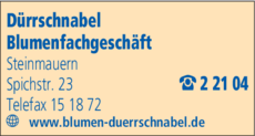 Die Adresse von Dürrschnabel lautet: Spichstr. 23, 76479 Steinmauern