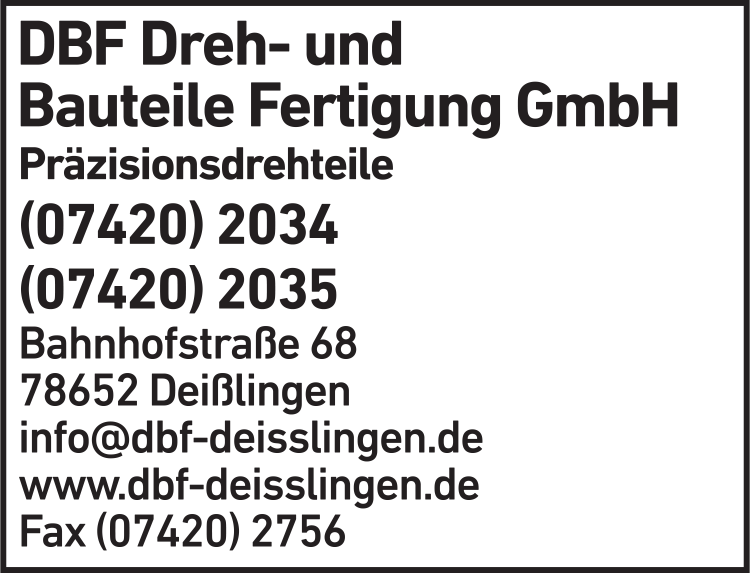 DBF Dreh-u. Bauteile-Fertigung GmbH 07420 20 34 Deißlingen Bahnhofstr. 68 78652