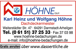 Dachdeckerei Höhne GbR 06151 37 25 33 Darmstadt Weiterstädter Str. 47 64291 Arheilgen https://media.roeser-online.de/02/123/LOGO/000/368/211_200x100.png
