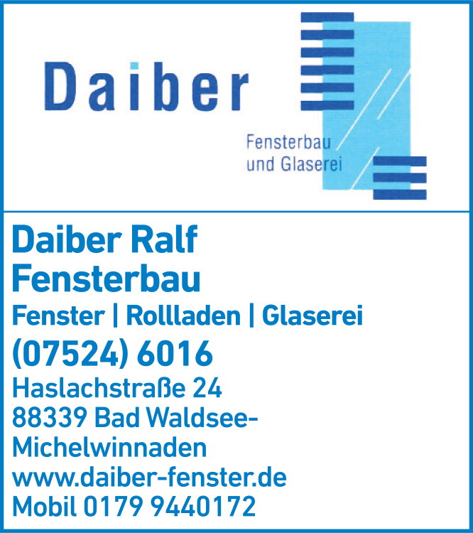 Die Adresse von Daiber Ralf Fensterbau lautet: Haslachstr. 24, 88339 Bad Waldsee