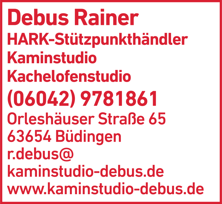 Die Adresse von Debus Kamin- und Kachelofenstudio, HARK Stützpunkthändler lautet: Orleshäuser Str. 65, 63654 Büdingen