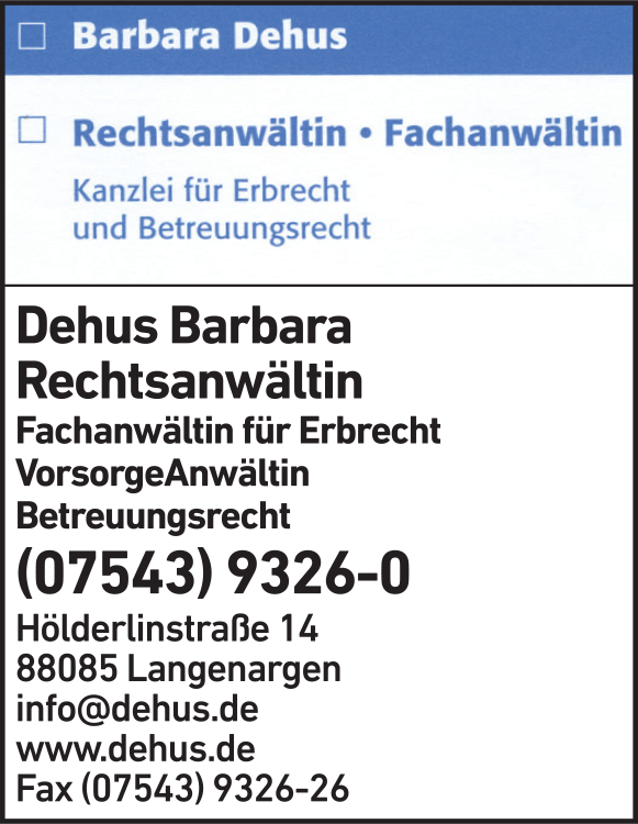 Die Adresse von Dehus Barbara Rechtsanwältin lautet: Hölderlinstr. 14, 88085 Langenargen