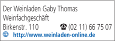 Der Weinladen Gaby Thomas Weinfachgeschäft 0211 66 75 07 Düsseldorf Birkenstr. 110 40233 Flingern Nord de.teleauskunft.oetb.webapp2.detail.Graphic@6819f411