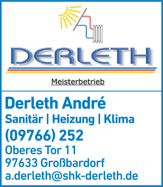 Die Adresse von Derleth André Heizung und Installation lautet: Oberes Tor 11, 97633 Großbardorf