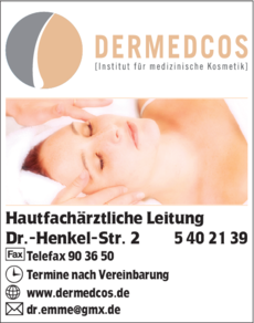 Dermedcos-Hautzentrum Erding bietet Hautkrankheiten, Akne, Allergien, Tiefenreinigung, Hautunreinheiten, Muttermale, Lichttherapie, Kausale Aknetherapie, Faltentherapie und Kosmetik an.