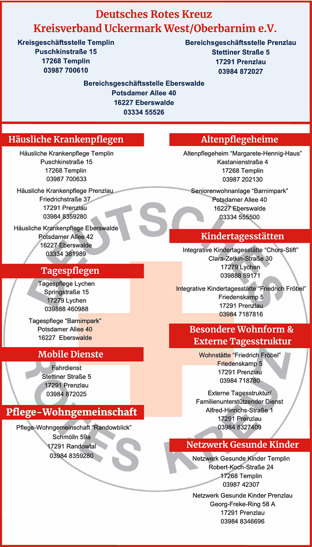 Die Adresse von Deutsches Rotes Kreuz DRK lautet: Stettiner Str. 5, 17291 Prenzlau