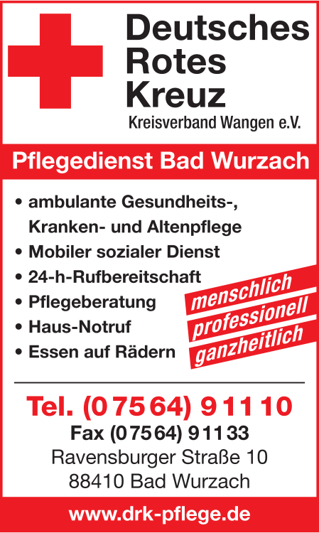 Die Adresse von Deutsches Rotes Kreuz Kreisverband Wangen e.V. lautet: Ravensburger Str. 10, 88410 Bad Wurzach
