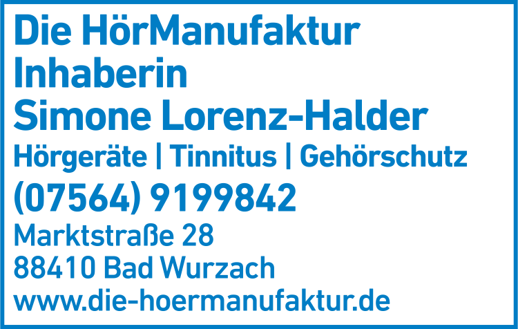 Die Adresse von Die HörManufaktur, Simone Lorenz Hörgeräte lautet: Marktstr. 28, 88410 Bad Wurzach