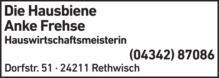 Die Adresse von Die Hausbiene Anke Frehse lautet: Dorfstr. 51, 24211 Rethwisch