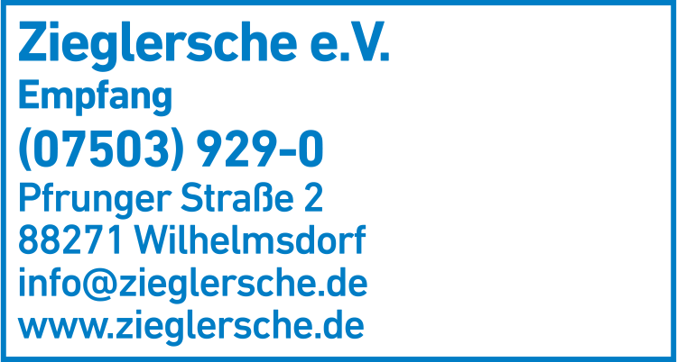 Die Adresse von Die Zieglersche e.V. lautet: Pfrunger Str. 2, 88271 Wilhelmsdorf