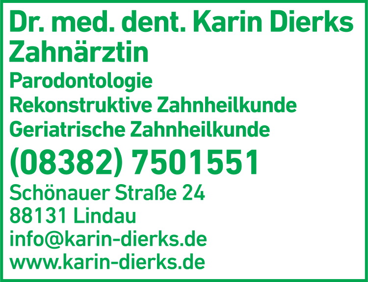 Die Adresse von Dierks Karin Zahnärztin lautet: Schönauer Str. 24, 88131 Lindau (Bodensee)