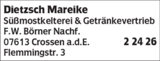 Die Adresse von Dietzsch Mareike lautet: Flemmingstr. 3, 07613 Crossen