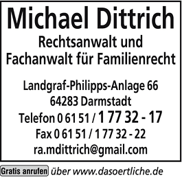Die Adresse von Dittrich Michael Rechtsanwalt lautet: Landgraf-Philipps-Anlage 66, 64283 Darmstadt