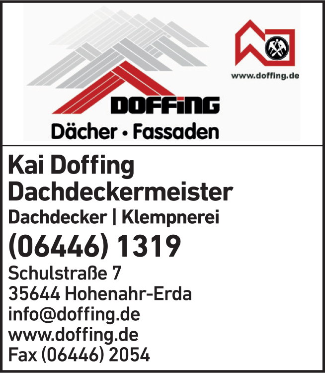 Die Adresse von Doffing Kai Dachdeckermeister lautet: Schulstr. 7, 35644 Hohenahr-Erda