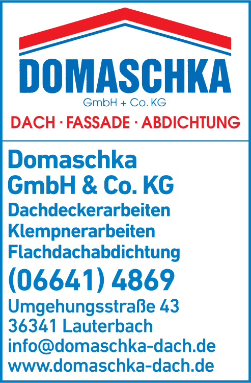 Die Adresse von Domaschka GmbH & Co. KG Dach - Fassade - Abdichtung lautet: Umgehungsstr. 43, 36341 Lauterbach