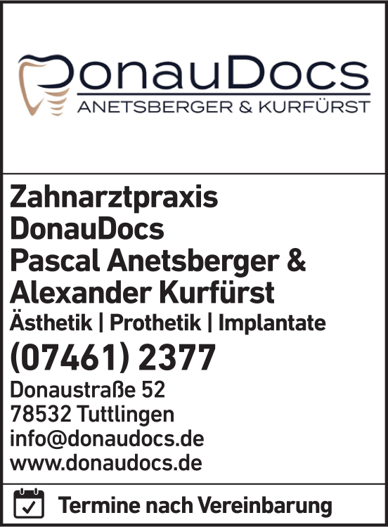 Die Adresse von DonauDocs Anetsberger & Kurfürst Zahnarztpraxis lautet: Donaustr. 52, 78532 Tuttlingen
