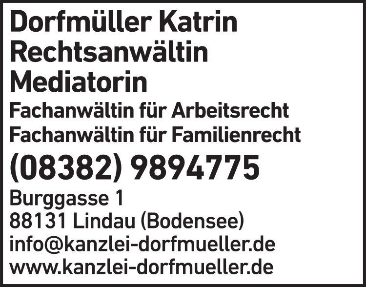 Die Adresse von Dorfmüller Katrin Rechtsanwältin lautet: Burggasse 1, 88131 Lindau