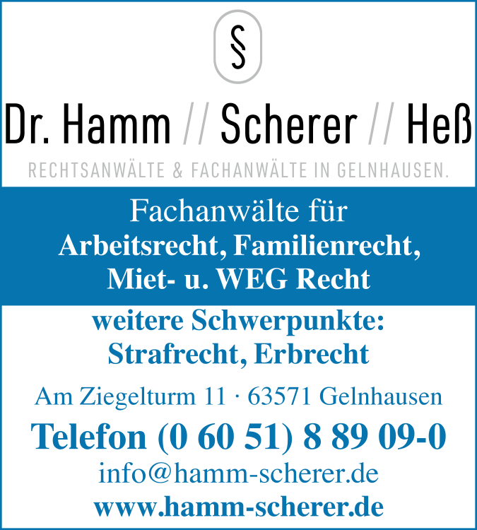 Die Adresse von Dr. Hamm /Scherer/Heß Rechtsanwälte lautet: Am Ziegelturm 11, 63571 Gelnhausen