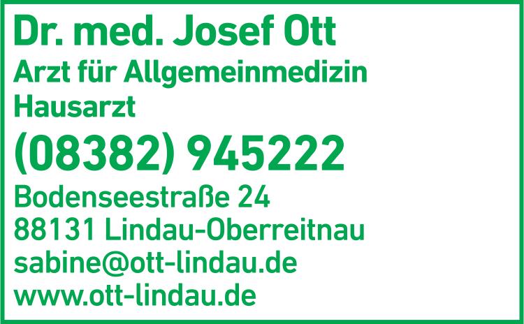 Die Adresse von Dr. med. Josef Ott Arzt für Allgemeinmedizin lautet: Bodenseestr. 24, 88131 Lindau (Bodensee)