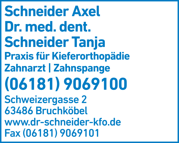 Die Adresse von Dr. med. dent. Axel Schneider und Tanja Schneider Praxis für Kieferorthopädie lautet: Schweizergasse 2, 63486 Bruchköbel