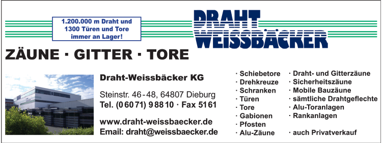 Die Adresse von Draht Weissbäcker KG Drahtzaunbau Drahtgeflechte lautet: Steinstr. 46-48, 64807 Dieburg