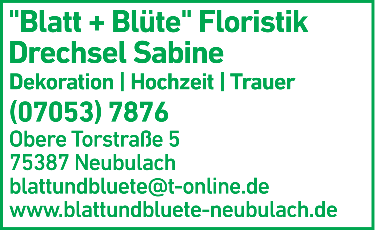 Die Adresse von Drechsel Sabine Blatt & Blüte Blumen lautet: Obere Torstr. 5, 75387 Neubulach
