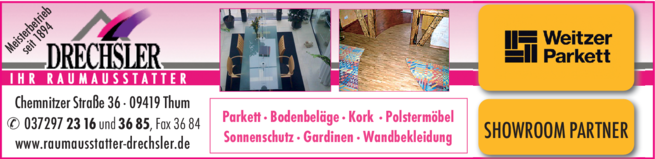 Die Adresse von Drechsler Raumausstatter Thum - Raum+Boden+Schatten lautet: Chemnitzer Str. 36, 09419 Thum