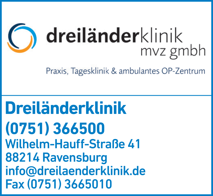 Die Adresse von Dreiländerklinik MVZ GmbH Fachärzte für Chirurgie, Orthopädie, Rehabilitative Medizin lautet: Wilhelm-Hauff-Str. 41, 88212 Ravensburg