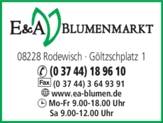 Die Adresse von E&A Blumenmarkt lautet: Göltzschplatz 1, 08228 Rodewisch