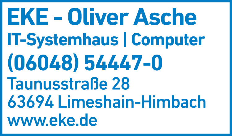 Die Adresse von EKE - Oliver Asche IT-Systemhaus lautet: Taunusstr. 28, 63694 Limeshain