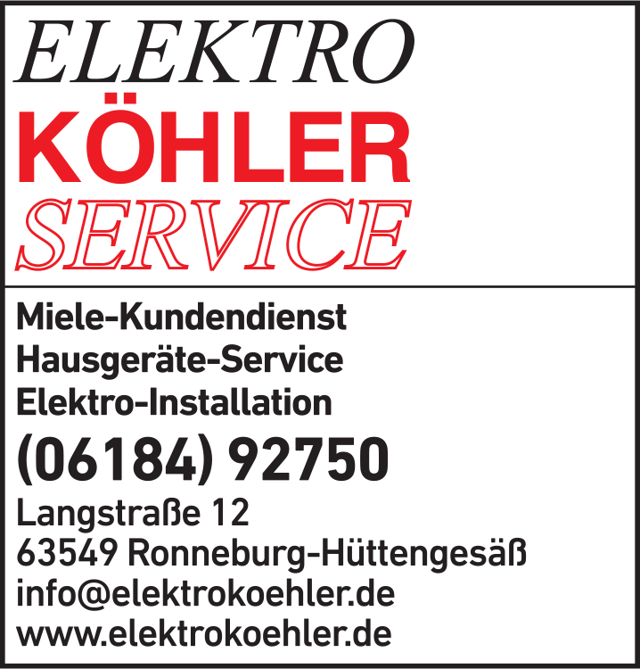 ELEKTRO KÖHLER SERVICE Jens Köhler Elektrofachmarkt und Installation 06184 92 75-0 Ronneburg Langstr. 12 63549 Hüttengesäß 5 5 1