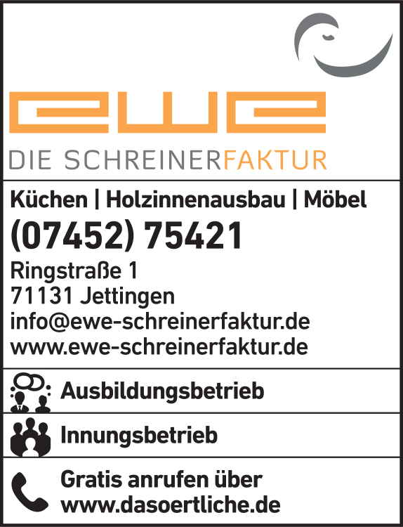 Die Adresse von EWE Die Schreinerfaktur lautet: Ringstr. 1, 71131 Jettingen