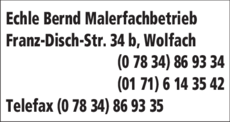Die Adresse von Echle Bernd lautet: Franz-Disch-Str. 34 B, 77709 Wolfach