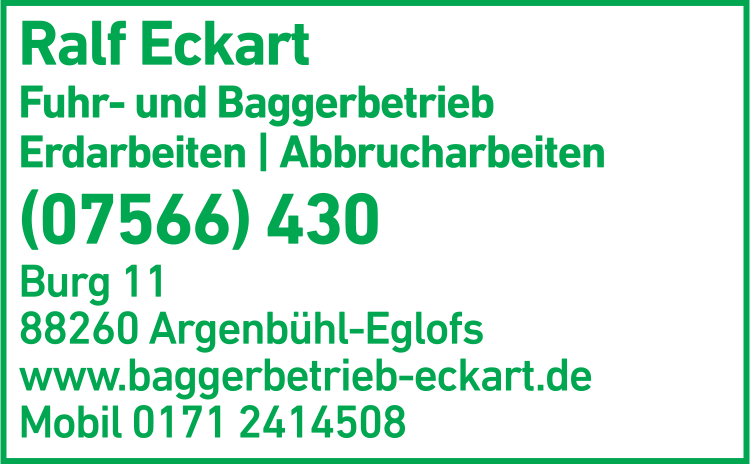 Die Adresse von Eckart Ralf Baggerbetrieb lautet: Burg 11, 88260 Argenbühl-Eglofs