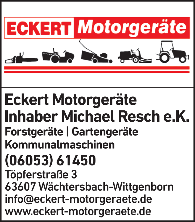 Eckert Motorgeräte Inh. Michael Resch 06053 61 45-0 Wächtersbach Töpferstr. 3 63607 Wittgenborn de.teleauskunft.oetb.webapp2.detail.Graphic@66bcb316 4.5 5 3
